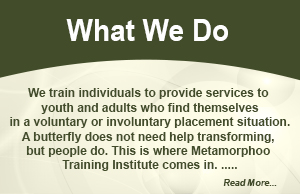 Just as the caterpillar eats and eats and eats, the master learner or teacher is dedicated to consuming as much knowledge or training to gain information that will ultimately prepare him or her for their life-changing process. When preparing for change, there is no greater investment that one can make than to invest their time and energy into learning new skills. Required skills that prepare them to enter or promote within the residential care industry. An industry that provides services to youths or adults who find themselves in a voluntary or involuntary placement situation. Maybe butterflies need no help transforming but people do. This is where the Metamorphoo Training Institute comes in. We believe, that we are all, at any given time transitioning from one life stage to another, and that ‘training is… a life-changing processes". Therefore, training is who we are and training is what we do.